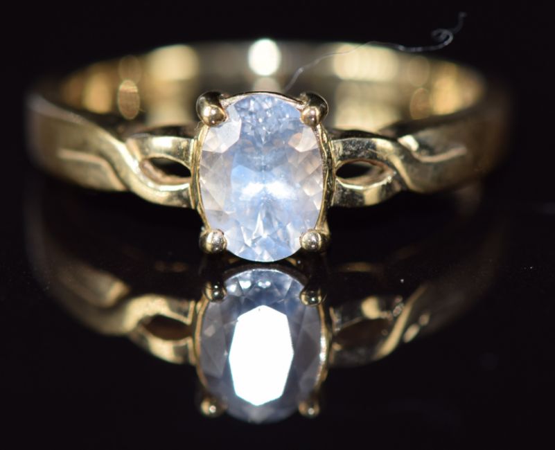 A 9ct gold ring set with an oval cut white sapphire, 3g, size M/N