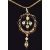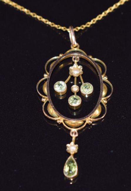 Edwardian pendant set with peridots and seed pearls on 9ct gold chain, pendant 4.6cm and chain 38cm, 3.8g