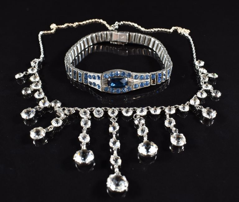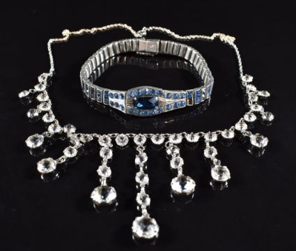 Art Deco silver bracelet set with blue paste and a silver necklace set with paste