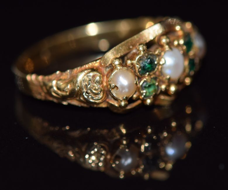 Victorian gold ring set with split pearls and tourmaline with embossed decoration to the shoulders, 2g, size K