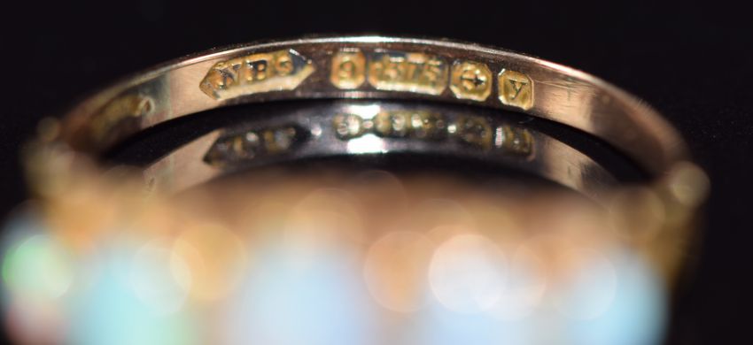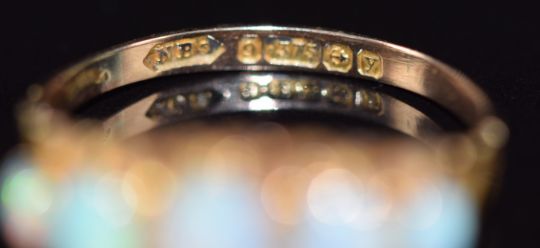 A 9ct gold ring set with five opal cabochons, Birmingham 1923, maker NBs, 1.6g, size R