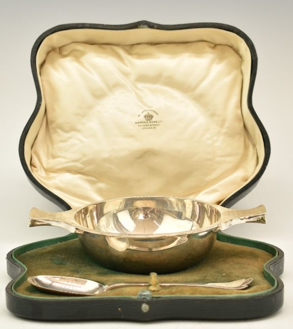 Mappin & Webb cased George V hallmarked silver quaiche and rat tail dog nose spoon, Sheffield 1914, the quaiche by Mappin & Webb, the spoon by Cooper Brothers & Sons Ltd, width of quaiche 18cm, weight of both 227g
