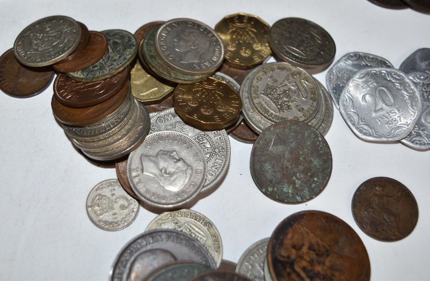 An album containing world coinage 19thC onwards, includes some silver and a few Indian 'pirate cob' coins together with a quantity of mixed coins Queen Victoria onwards, small silver content