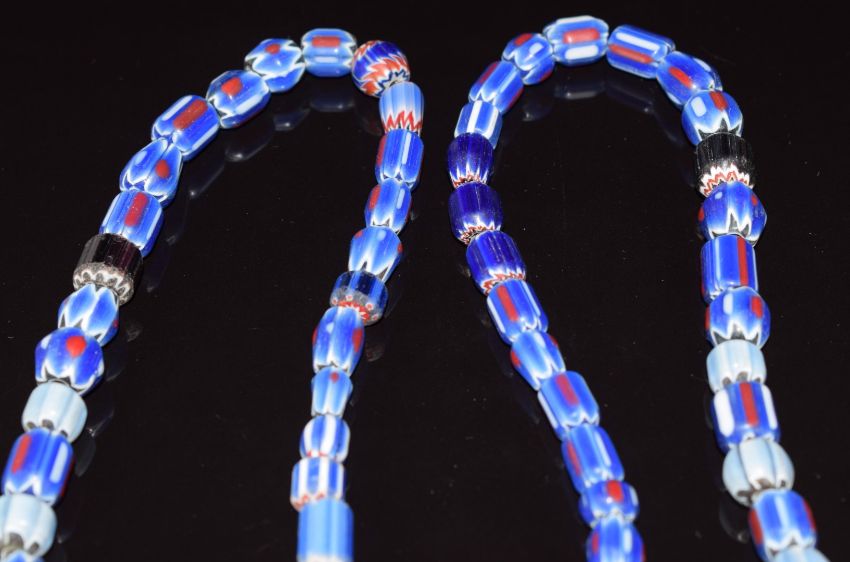 Venetian glass necklace made up of seventy six 19thC Venetian four, five & six layer blue chevron trade beads, largest bead 1.4 x 0.9cm,105g