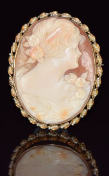 A 14k gold brooch set with a cameo with seed pearl rim, 11.4g, 4.5 x 3.5cm