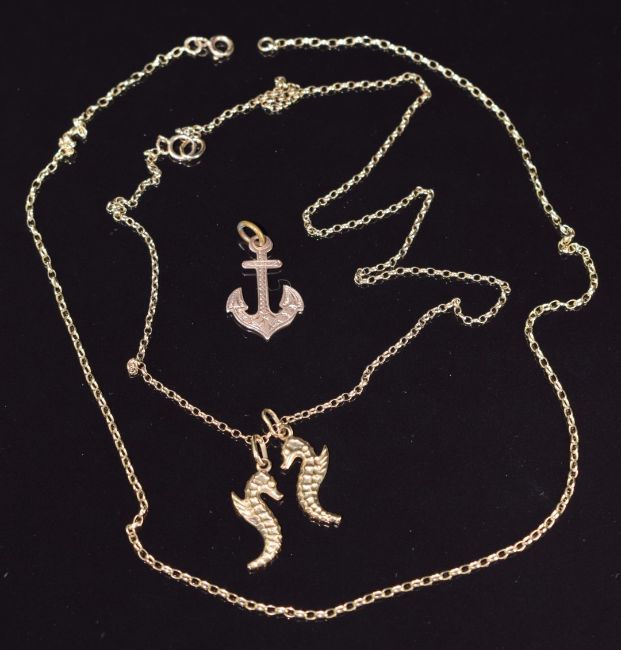 Two 9ct gold chains/ necklaces, two 9ct gold seahorse charms and a Victorian 9ct rose gold anchor, 7.3g