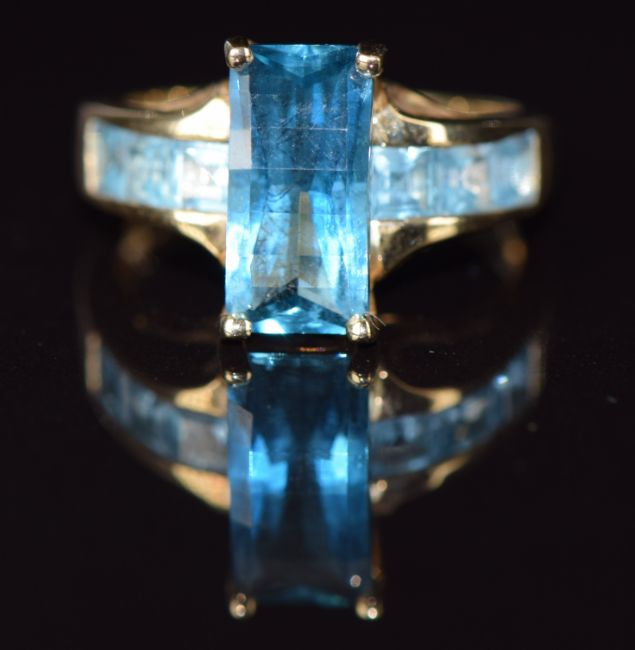 A 9ct gold ring set with London and Swiss blue topaz, 4.5g, size N