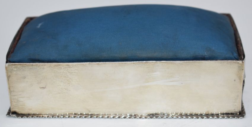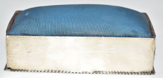 Victorian or Edward VII hallmarked silver mounted pin cushion, Birmingham 1901, maker William Henry Leather, length 16cm