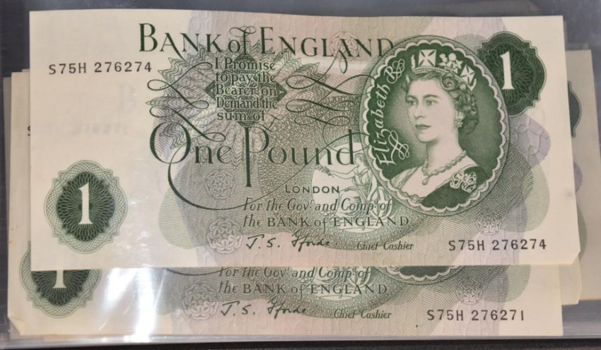 A collection of UK and overseas coinage, Queen Victoria onwards, with collector trays, together with a small album of banknotes, UK, Ireland, USA, Jersey etc, including some consecutive UK £1 notes