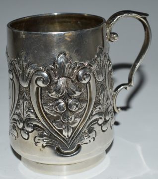 Victorian hallmarked silver tankard with embossed decoration, London 1897, maker William Hutton & Sons Ltd, height 8cm, weight 128g
