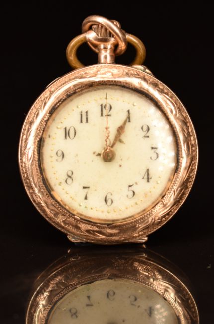 Unnamed 14ct gold keyless winding open faced pocket watch with gold hands, Arabic numerals, cream dial and unsigned movement, case diameter 28mm, serial number 26289, 18.2g.