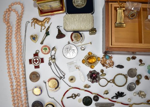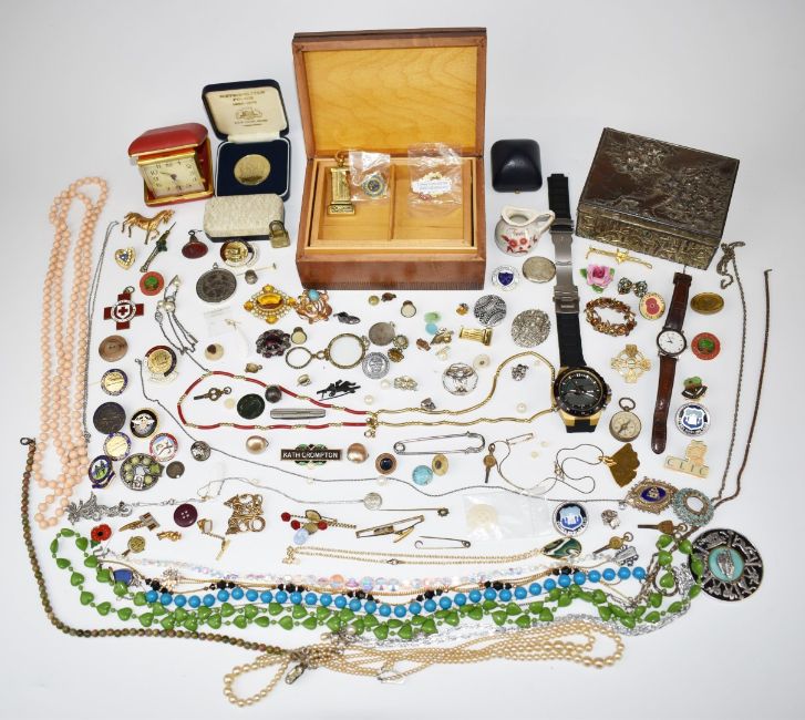 A collection of costume jewellery including vintage brooches, silver St Christopher, vintage watch keys, necklaces, etc