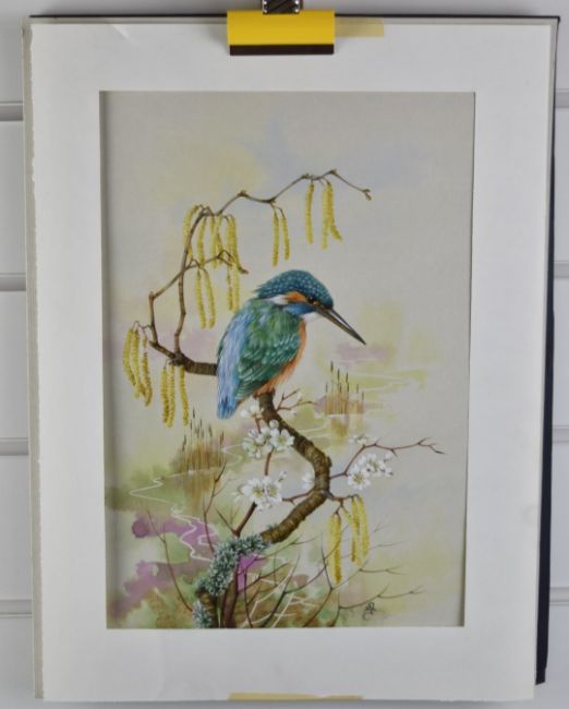 Daphne Ellman (Isle of Wight artist) watercolour/gouache study of a kingfisher on a branch, monogrammed lower right, 32 x 21.5cm
