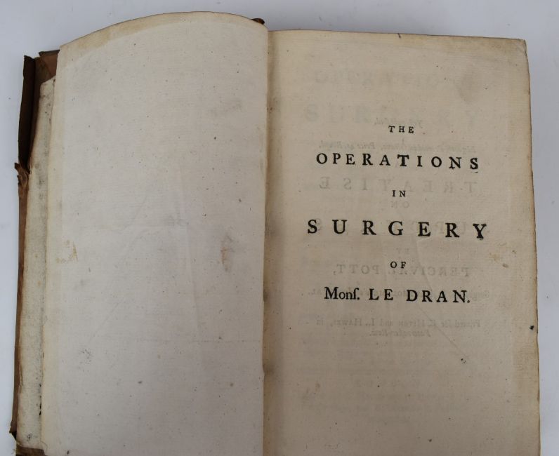 [Surgery] The Operations in Surgery of Mons(eur) Le Dran, Senior Surgeon of the Hospital of La Charité, Consulate Surgeon to the Army..translated by Mr. Gataker with Remarks, Plates of the Operations and a Sett of Instruments by Mr. Cheselden, printed for C. Hitch & L. Hawes 1757 third edition with 20 (of 22) engraved plates bound in leather over boards (worn). A Treatise on The Hydrocele or Watry Rupture and Other Diseases of the Testicle It's Coats and Vessels (Illustrated with Cases) by Percivall Pott surgeon to St. Bartholomew's Hospital, printed for L. Hawes, W. Clarke & R. Collins 1773 third edition with two engraved plates bound in leather over boards, with mild wear WITH a Dictionary on Physical, Anatomy and Surgery by J. Barrow 1749 lacking most of title page and front cover (3)