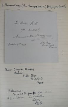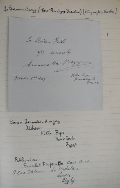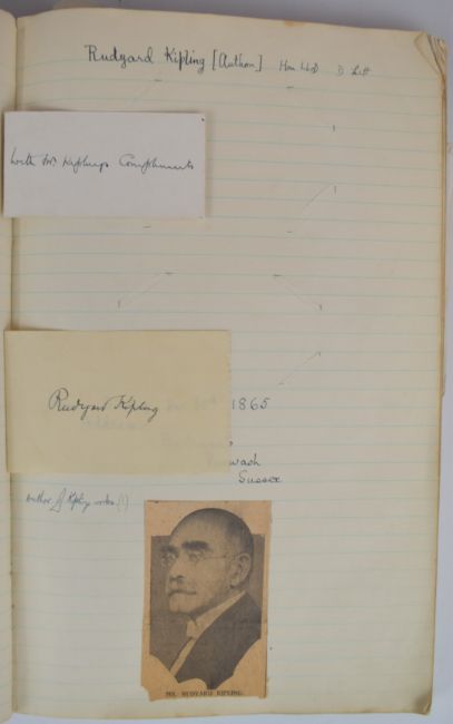 An autograph scrapbook of signatures collected by Brian Frith MBE of Gloucester, who began the book in 1921. Signatures include Winston Churchill, Rudyard Kipling, John Logie Baird, David Lloyd George, Stanley Baldwin, GK Chesterton, Frank Brangwyn, Ramsay Macdonald, General Sir Ian Hamilton, Admiral Jellicoe, Field Marshal Allenby, Sir Henry J Wood, Lord Lonsdale, Earl Balfour, John Buchan and many more, most with annotations added by Brian Frith. Together with three 'polite refusal' letters comprising Bernard Shaw, Marie Curie and the Prince of Wales, and Frith's own exercise book of notes on his collection, entitled 'My Autographs' and giving details of his collecting, including how he visited prominent people using a copy of Who's Who and a map.