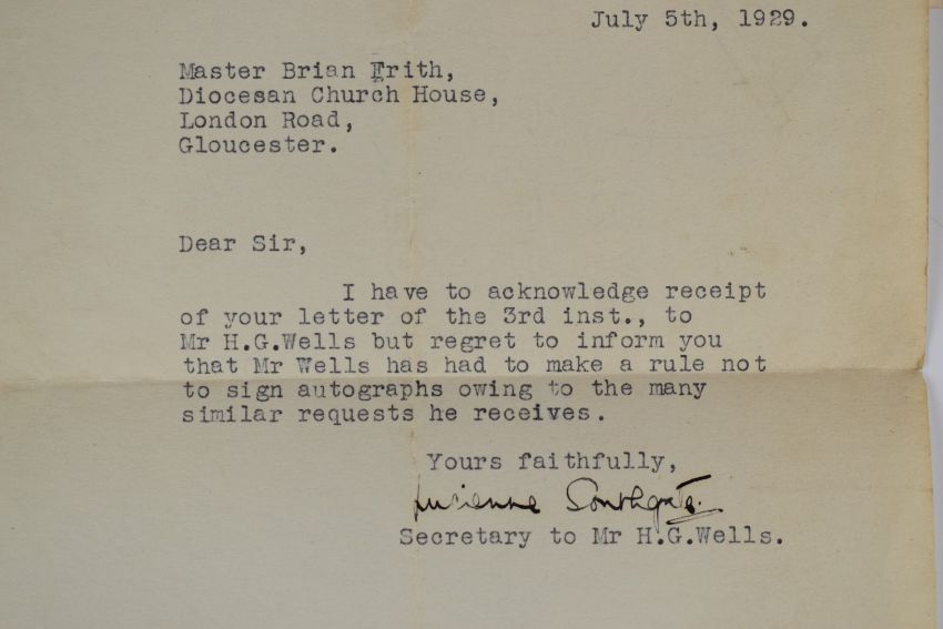 H G Wells signed autograph letter, with original envelope addressed to Mrs Perry, 3 Park Hill, Ealing, the letter dated 31st July 1906 on paper embossed Spade House, Sandgate together with a further letter from H G Wells declining a request for an autograph