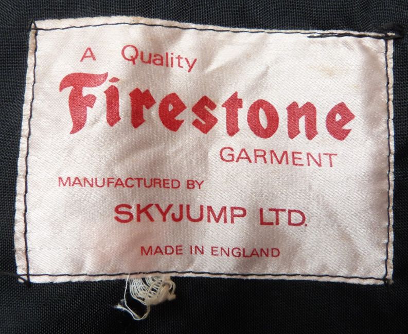 Vintage/ classic Firestone motor car racing jacket having zip off hood, with applied patches for BARC, British Racing and Sportscar Club, Lotus and British Leyland