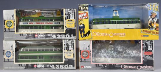Eleven mainly Corgi diecast model trams including Corgi Classics, Original Omnibus Company (OOC), Trams of The World, Dobsun's Dry Soap, Commercials etc, all in original boxes.