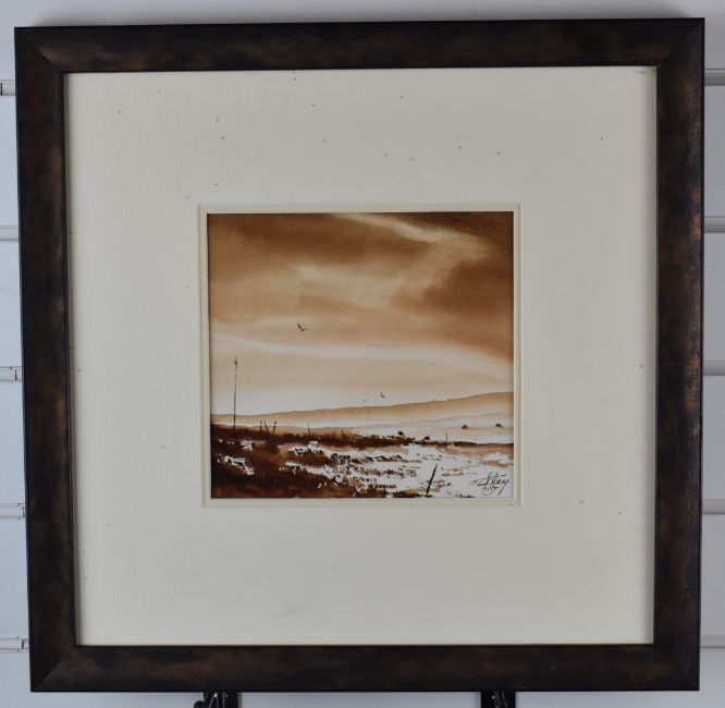Ashley Jackson (b 1940) watercolour of a moorland scene with birds, signed lower right, 20 x 21cm, signed verso, in bronzed frame