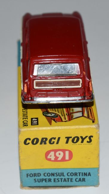 Corgi Toys diecast model Ford Consul Cortina Super Estate Car with red body, cream interior and wood effect panels, 491, in original box.