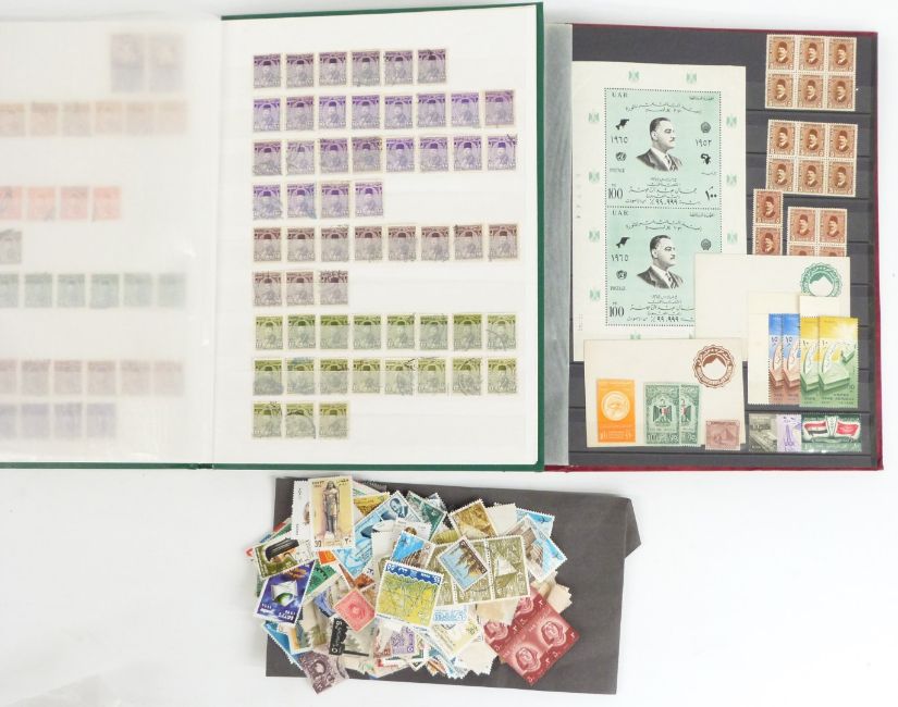 A mint and used collection of stamps from Egypt in two stockbooks and loose, from early issues to modern including mint blocks, minisheets etc