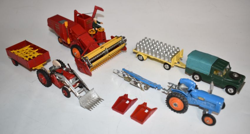 Corgi Major Toys diecast model Gift Set 22 Framing Models with Fordson Power Major Tractor, Plough, Massey Ferguson Combine Harvester, Massey Ferguson 65 Tractor with Loading Shovel, Tipping Trailer, Land Rover, Platform Trailer with Milk Loads and 2 Tractor Driver figure, in original box.