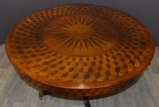 Parquetry and marquetry drum table, purchased by the vendor from Harrods, diameter 122 x height 77cm