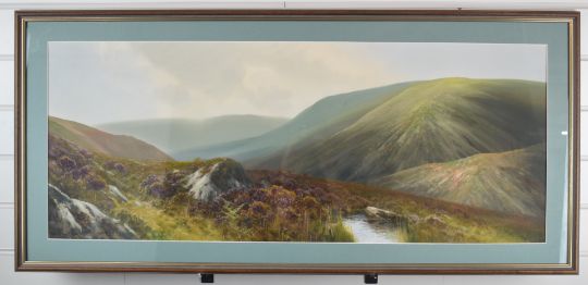 J Whiteley watercolour landscape 'The Doone Valley, Exmoor', signed and titled lower left, 38 x 97cm, in gilt frame