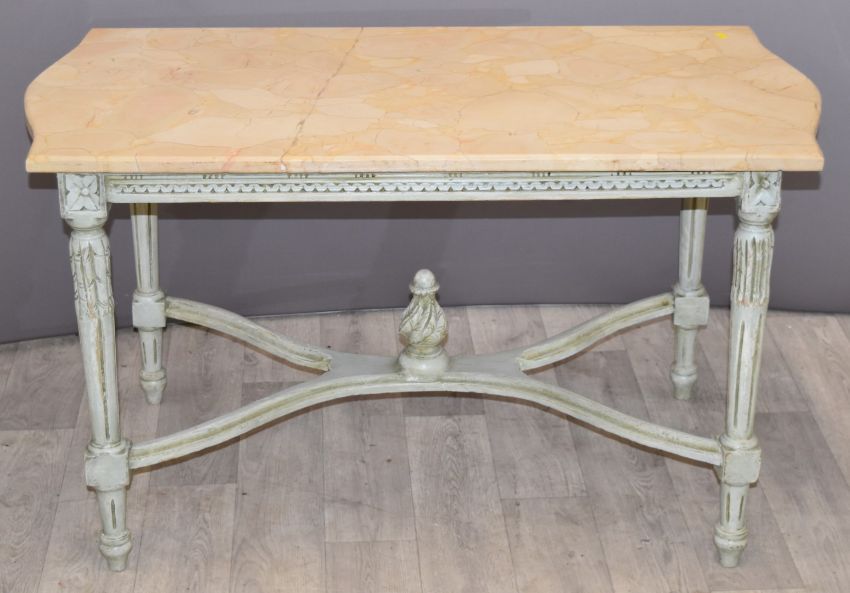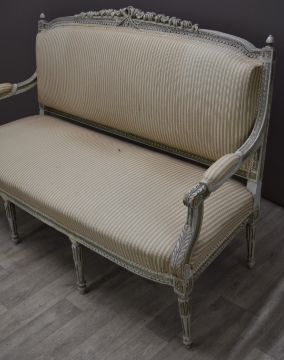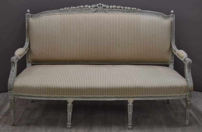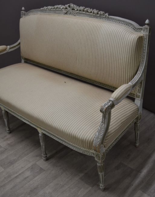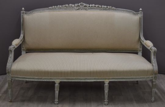 French four piece salon suite comprising sofa, two chairs and table, length of sofa 150cm