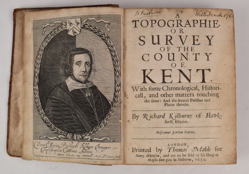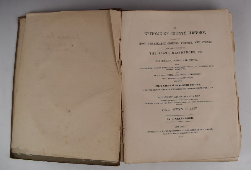 A Topographie or Survey of the County of Kent with some Chronological Historicall, and other matters touching the same: And the several Parishes and Places therein by Richard Kilburne of Hawkherst, printed by Thomas Mabb 1659 first edition with engraved portrait bound in full leather with raised bands and gilt lettered label (dated name top title page with covers worn and loose board). A Treatise of Gavelkind both Name and Thing shewing The True Etymologie and Derivation of the One, the Nature, Antiquary and Original of the Other with Observations of Kentish-men etc etc by William Somner with A Life of the Author printed for F. Gyles, J. Woodman, D. Lyon and C. Davis 1726 2nd Corrected Edition with engraved frontispiece in leather boards (worn & front board detached). An Epitome of County History, wherein the Most Remarkable Object, Persons and Events are briefly treated of etc Vol.1 KENT by C. Greenwood illustrated with a map [present] published 1838 bound in paper backed boards (worn) (3)