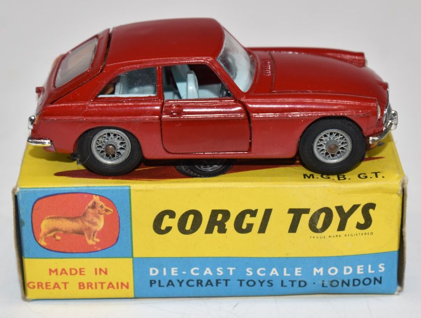 Corgi Toys diecast model MGB GT with red body and cream interior, 327, in original box.
