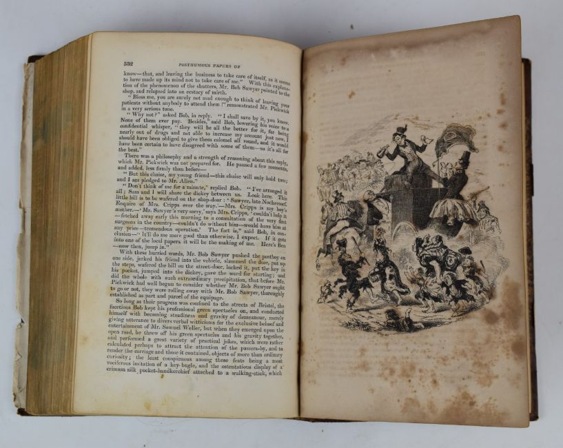 The Posthumous Papers of The Pickwick Club by Charles Dickens with 43 illustrations by R. Seymour and Phiz, published Chapman & Hall 1837 first edition with frontispiece and engraved title bound in half leather with raised bands and gilt leather label. Some spotting & browning of plates - portrait of author loosely inserted