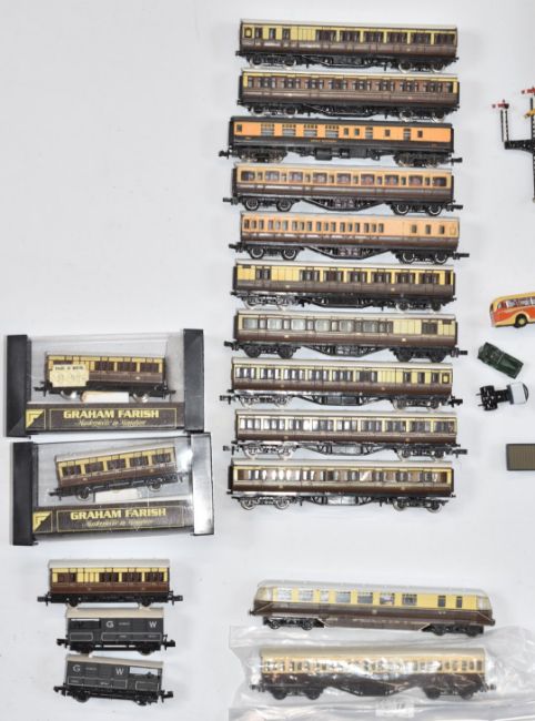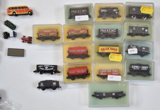 Thirty-eight Graham Farish, Dapol and similar N gauge model railway locomotives, coaches, wagons, vans and accessories, some in original boxes, together with a quantity of N gauge track.