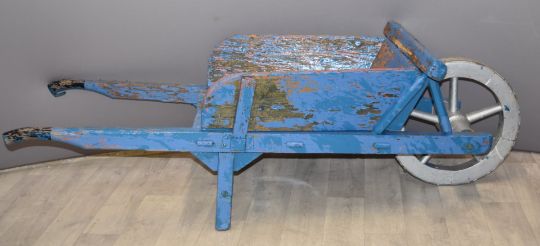 Victorian or early 20thC wooden wheelbarrow with metal wheel rim, length 160cm