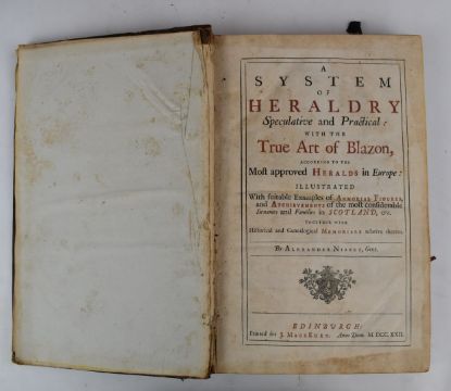 The History of Scotland from The Accession of the House of Stuart to that of Mary, with Appendixes of Original Papers by John Pinkerton printed for C. Dilly 1797 in 2 folio volumes with Engraved Portrait volume 1 bound in full leather with decorative stamped borders both covers raised bands with decorated panels and gilt titles (volume 2 hinge worn but covers holding). A System of Heraldry Speculative and Practical with the True Art of Blazon according to the Most approved Heralds in Europe: Illustrated with suitable Examples...by Alexander Nisbet printed Edinburgh for J. MackEuen 1722 in 2 folio volumes with 52 engraved plates and titles printed in red & black in (worn) leather bindings with boards loose or detached (4)
