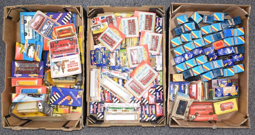 Over 130 Matchbox, Majorette, Corgi, Budgie, EFSI and similar diecast model vehicles including buses and coaches, all in original boxes.