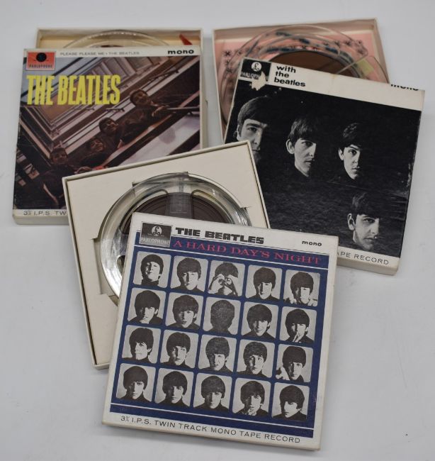 Vintage Beatles publications including Beatles Ltd with photographs by Robert Freeman, 1964 Beatles Book calendar, Here Are The Beatles and True Story of the Beatles etc and reel to reels for Please Please Me, With The Beatles and A Hard Day's Night