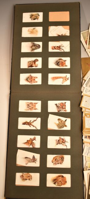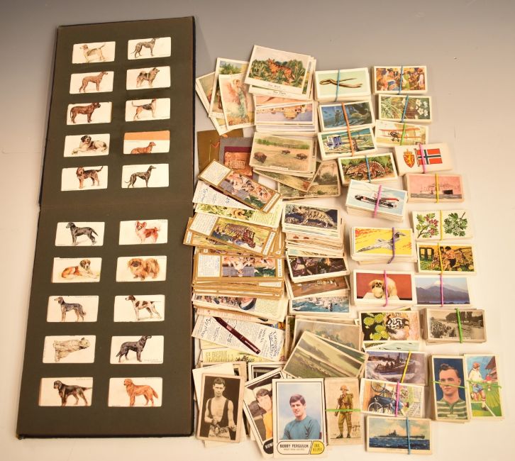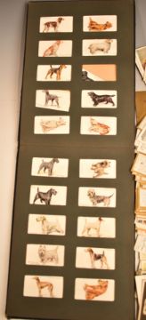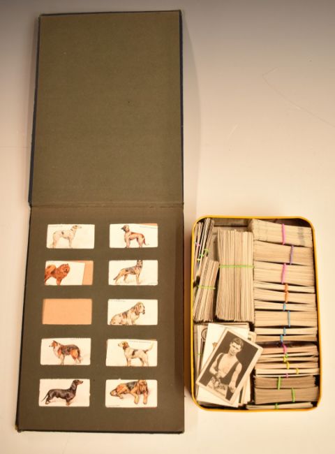 Cigarette cards to include Kensitas silks, Players dogs, Ty-phoo tea cards including work on the farm, together with a vintage aluminium tin, diameter 24cm
