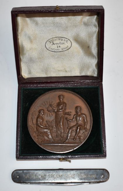 Bronze medallion awarded to Deakin Parker & Co for steam engines 1880 for the Manchester Industrial Exhibition, together with a Browett-Lindley virtual steam and gas engine promotional folding knife