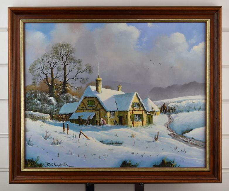 Peter Cosslett (born 1927) oil on canvas thatched cottage in the snow, signed lower left, 40 x 50cm, in part gilt frame