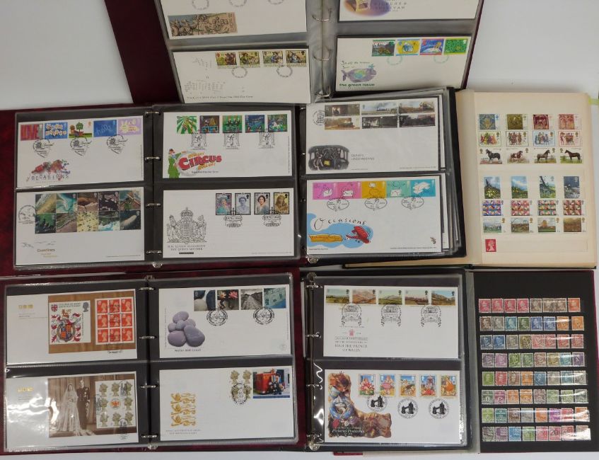 Five folders of GB modern first day covers and two further stock albums of mint and used GB and world stamps