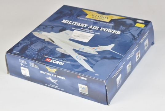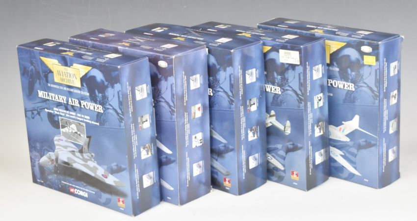 Five Corgi The Aviation Archive Military Air Power 1:144 scale limited edition and 1st issue diecast model aeroplanes Hercules CK1 Tanker 48401, Bristol Britannia 253/CMK1 48604, Lockheed C-121A Constellation 47509, Avro Vulcan B2 XM607 48301 and HP Victor Mk2 48702, all in original boxes.