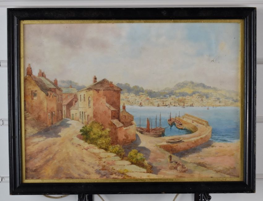 Irene Butler watercolour street scene with man leaning on railings, signed and dated 1912 lower left, 35 x 24cm, together with a watercolour harbour landscape, signed lower left Browize, 25 x 35cm