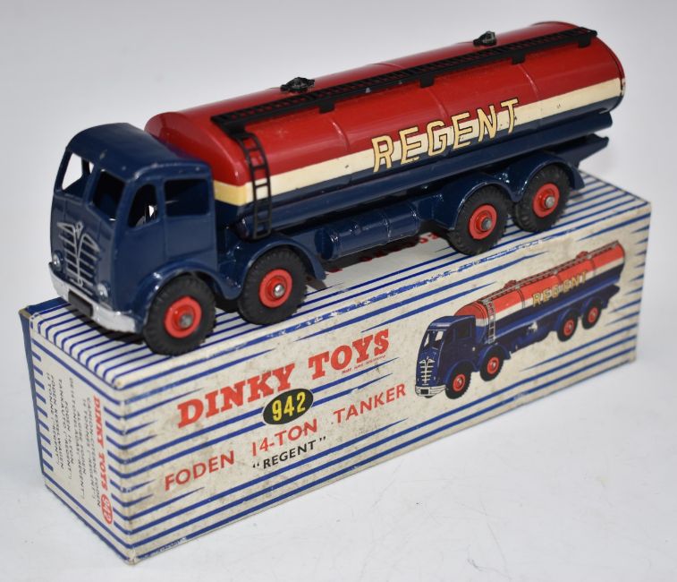 Dinky Toys diecast model Foden 14-Ton Tanker 'Regent' with blue chassis and cab, red hubs and red, cream and blue tank, 942, in original box.