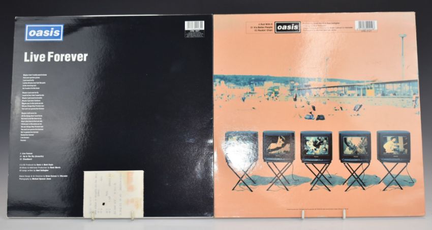 Oasis - 2 twelve inch singles comprising Live Forever (CRE 185T) and Roll With It (CRE 212T). Records, covers and inners appear EX