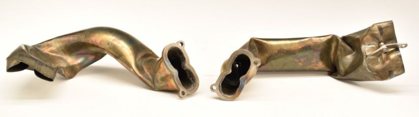 Marc Gene signed 2002 Williams BMW Formula 1 exhaust pipes, involved in a high speed crash at Silverstone involving car FW24. This lot is consigned by Steve Berry who worked at Williams producing exhaust primaries including these circa 1989-2009, a copy of a photograph showing the vendor with a set of exhaust primaries, with his colleague J Bennet is included with this lot