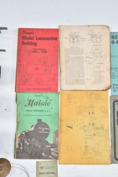 Three model live steam boilers, frames to suit an 0-4-0 locomotive, books etc, length of longest boiler 32cm