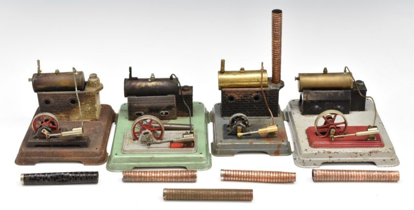 Four stationary live steam engines including two by Fleischmann with oscillating cylinders, together with a quantity of spare chimneys