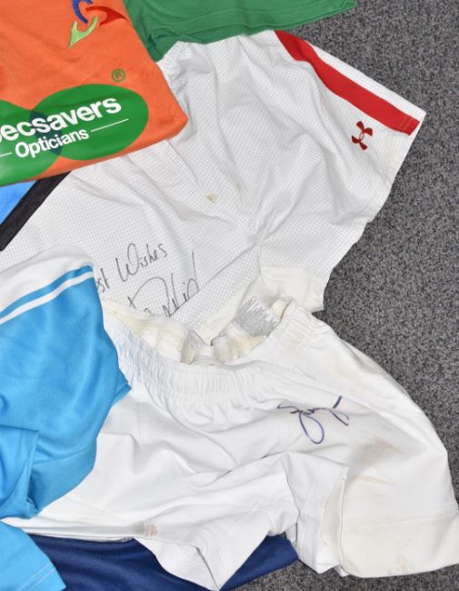 Approximately twenty items of Gloucester, Worcester and other rugby related clothing including a signed Gloucester shirt, Trevor Woodman shirt (unsigned), some unworn with labels, signed shorts etc