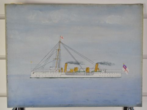 Late 19th or early 20thC oil on paper study of a Royal Navy steam ship flying the white ensign, monogrammed possibly AR, the reverse being a shipping chart of the Isle of Grain, 25 x 33cm